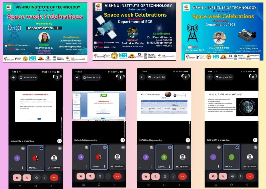 ![]() | The celebrations had mix of events like special sessions on antenna for Space and LEO Satellites etc, Poster Presentations on Space Technologies, and 2-days Hackathon on HAM Morse Code Trainer Kits. After the completion of all the events successfully the winners were appreciated with the Cash Prizes by our beloved Principal Dr. M. Venu and Vice-Principal Prof. M. Srilakshmi. | ||||||||||||