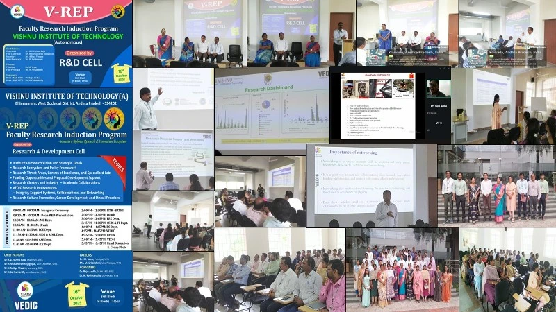 ![]() | The R&D Cell of Vishnu Institute of Technology organized the VREP – Faculty Research Induction Program on 16th October 2025 for faculty members with less than two years of experience. The event aimed to promote a strong research culture and featured sessions on the VIT Research Ecosystem (Dr. N. Padmavathy), SVES Research Ecosystem (Dr. Raju Aedla), and IITH–SATHI Facilities (Dr. Rajendra Prasad). Around 40 faculty members, along with HoDs, Deans, and R&D Coordinators, actively participated. The Dean (R&D) expressed gratitude to the Management, Principal, and Vice-Principal for their continuous support and extended special appreciation to Dr. Raju Aedla for conceptualizing the program. | ||||||||||||