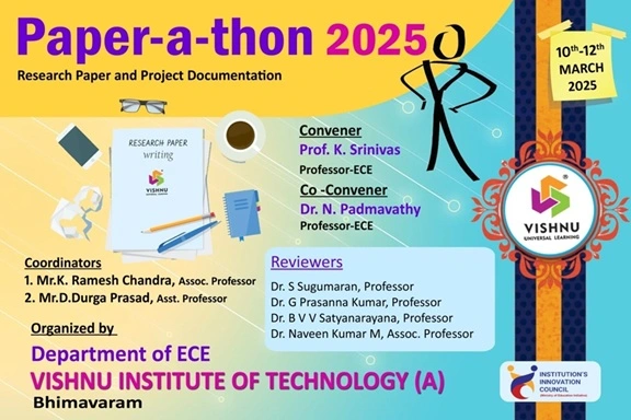 ![]() | The Department of Electronics and Communication Engineering (ECE) at Vishnu Institute of Technology successfully organized a three day research hackathon Paper-a-thon 2025 on 10th to 12th March 2025. The event saw participation from 46 research teams each accompanied by their respective faculty mentors creating a collaborative and intensive knowledge sharing platform. All teams wrote research papers and submitted them to various conferences and journals for publication. | ||||||||||||